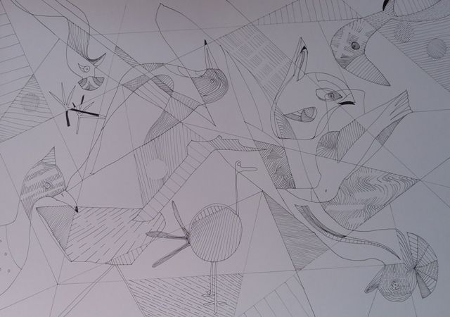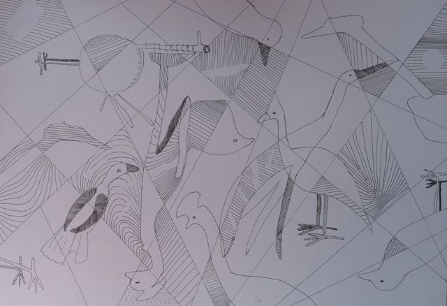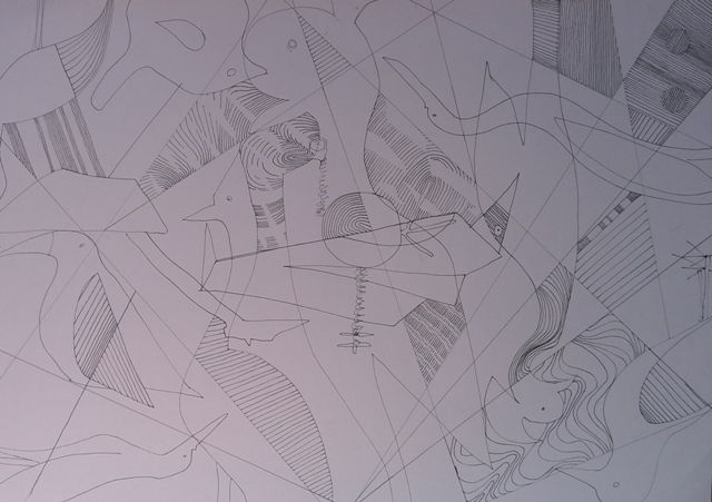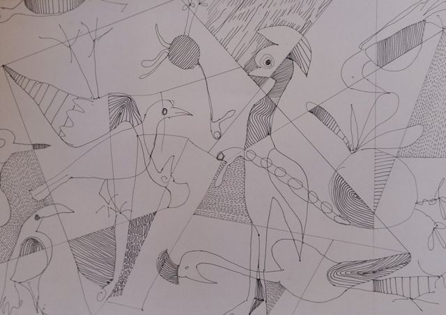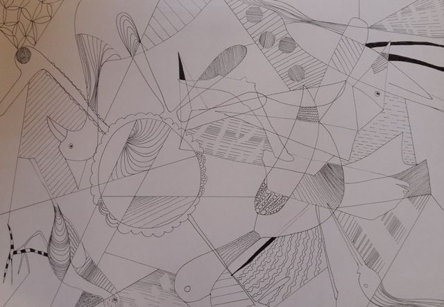 Our final more fun project had students drawing all over the paper, overlapping images and turning the paper around, before adding lines and further marks. One students even started to add in colour.